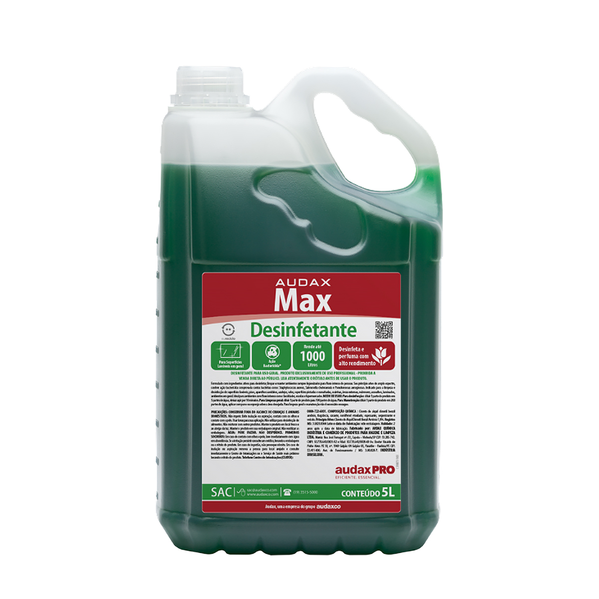 O Desinfetante Max Pinho 5L Audax é formulado com ingredientes ativos de amplo espectro, garantindo desinfecção e limpeza eficazes mesmo em ambientes com alto fluxo de pessoas. Com ação bactericida comprovada, elimina Staphylococcus aureus, Salmonella e Pseudomonas aeruginosa, proporcionando segurança e higiene completa. | Ideal para limpeza e desinfecção de pisos, azulejos, ralos, aparelhos sanitários, cozinhas, áreas externas, mármores, assoalhos, laminados e superfícies laváveis, o Max Pinho é a escolha perfeita para locais de grande circulação, como escolas, faculdades, hipermercados, aeroportos e estabelecimentos comerciais em geral. | Especificações do Produto: | Embalagem: 5 litros | Tamanho da embalagem: 31 x 17 x 12 cm | Diluições recomendadas: Desinfecção: 1/5 | Limpeza geral: 1/100 | Manutenção: 1/200 | Fragrâncias / Cores disponíveis: Pinho Fresh / Verde | Rendimento: até 1000 litros | Benefícios: | Eficaz contra bactérias importantes do dia a dia | Limpeza e desinfecção completa de superfícies laváveis | Produto versátil: pronto para desinfecção, limpeza geral ou manutenção | Ideal para ambientes com fluxo intenso de pessoas | Disponível em diversas fragrâncias agradáveis | Mantenha escolas, faculdades, empresas e estabelecimentos comerciais sempre limpos, higienizados e perfumados com o Desinfetante 5L Max Pinho Audax, garantindo proteção contra germes e bactérias de forma prática e eficiente. | Código: -8285