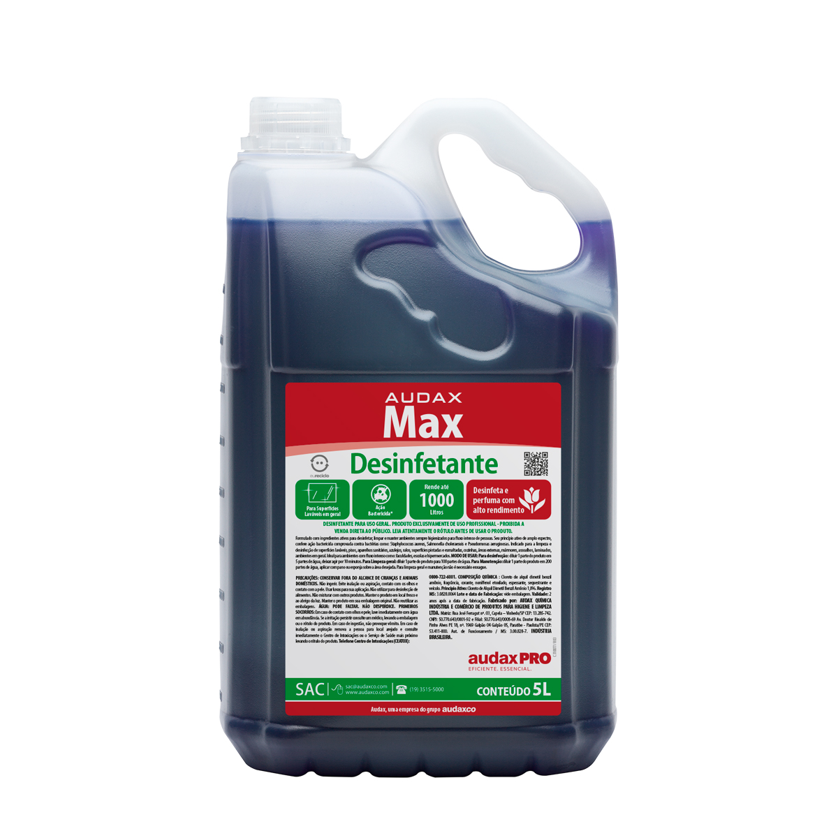 Desinfetante 5L Floral Max – Audax | Limpeza e Desinfecção para Ambientes Profissionais | O Desinfetante Floral Max 5L Audax é formulado com ativos de amplo espectro, garantindo desinfecção eficiente e limpeza de superfícies laváveis, mesmo em ambientes com grande fluxo de pessoas. Sua ação bactericida é comprovada contra Staphylococcus aureus, Salmonella e Pseudomonas aeruginosa, oferecendo higiene completa e segurança. | Perfeito para pisos, azulejos, ralos, aparelhos sanitários, cozinhas, áreas externas, mármores, assoalhos, laminados e superfícies pintadas ou esmaltadas, ele mantém ambientes limpos, perfumados e livres de germes, ideal para escolas, faculdades, comércios, hospitais, hotéis e empresas em geral. | Especificações do Produto: | Embalagem: 5 litros | Tamanho da embalagem: 31 x 17 x 12 cm | Diluições recomendadas: Desinfecção: 1/5 | Limpeza geral: 1/100 | Manutenção: 1/200 | Fragrâncias / Cores disponíveis: Floral / Roxo | Rendimento: até 1000 litros | Benefícios: | Limpeza e desinfecção eficaz contra bactérias comuns | Produto versátil: pronto para desinfecção, limpeza geral ou manutenção | Ideal para ambientes de alto fluxo de pessoas | Perfume Floral agradável que mantém o ambiente fresco | Econômico e prático para uso profissional | Mantenha seus ambientes limpos, higienizados e perfumados com o Desinfetante Floral Max 5L Audax, garantindo proteção contra germes e bactérias com eficiência e praticidade. | Código: -8536