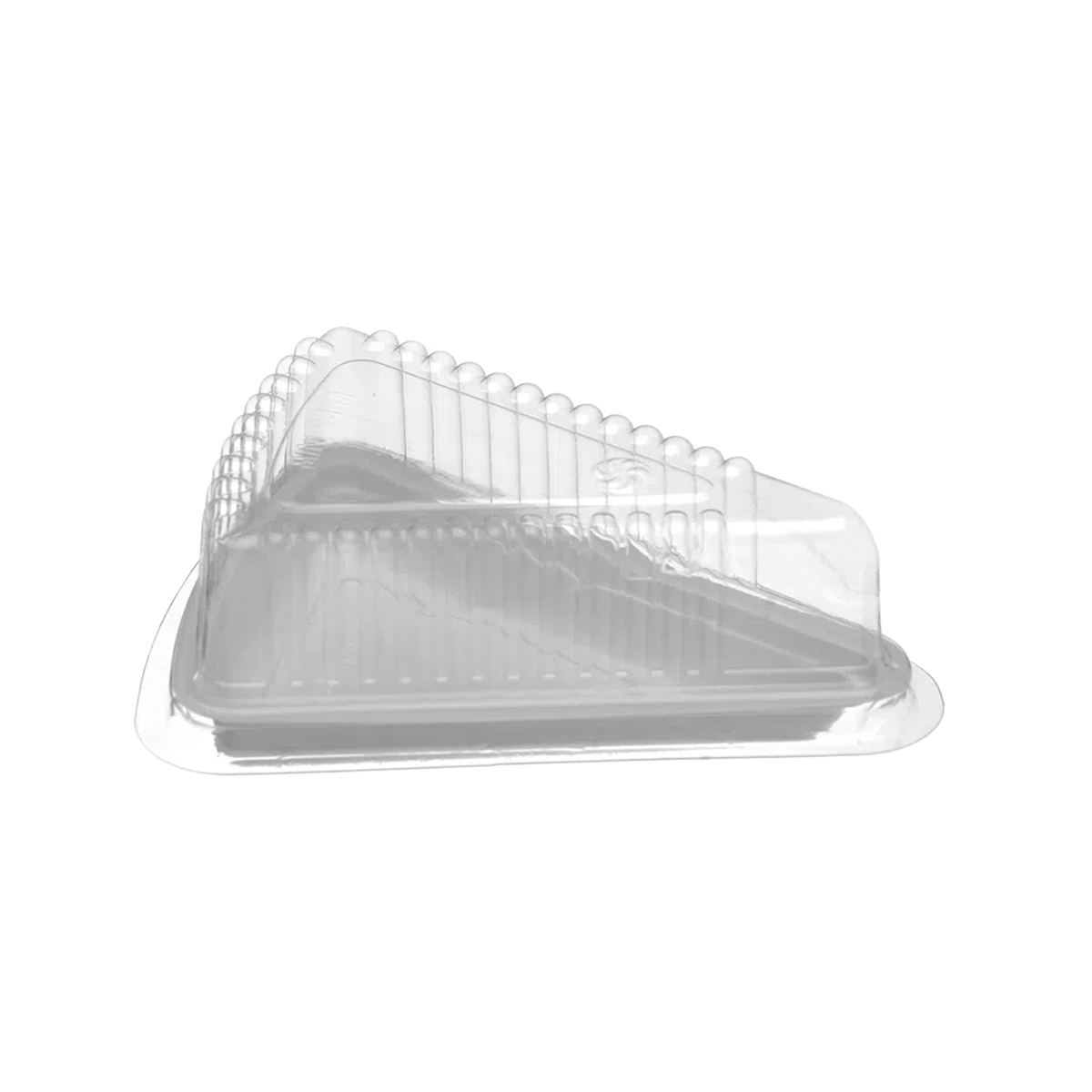 As embalagens plásticas para fatia de bolo ou torta contam com uma base feita do mesmo material, com uma camada mais reforçada em pet.