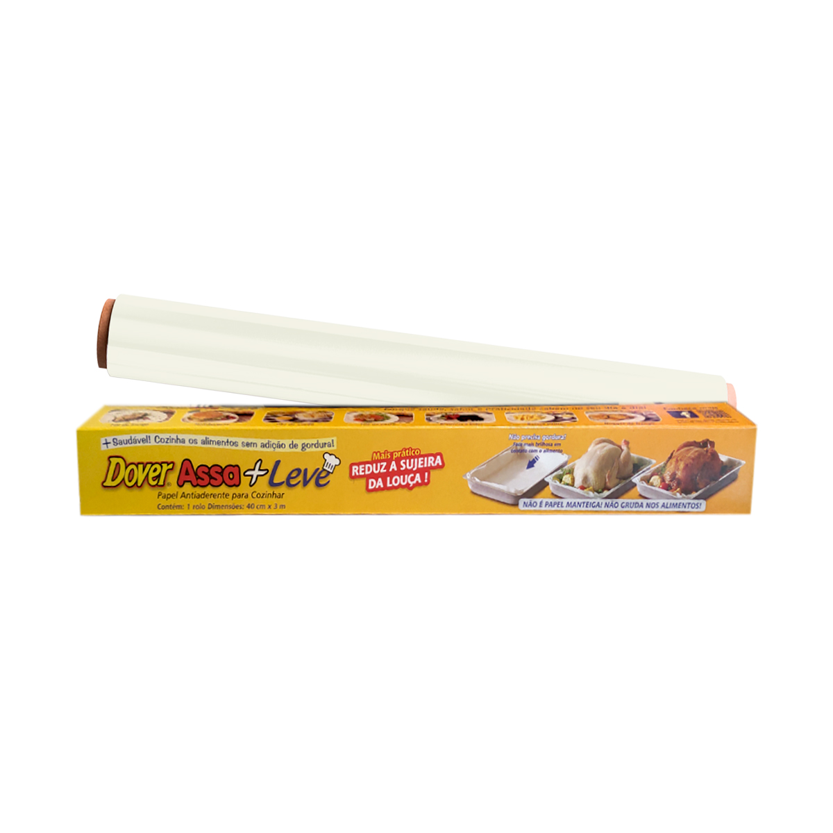 Papel Antiaderente Impermeável Dover Assa + Leve 40cm x 3m | Cozinhe sem gordura, sem sujeira e sem grudar | O Papel Antiaderente Dover Assa+Leve é a solução prática, econômica e saudável para o preparo dos seus alimentos | Ideal para forno, fogão, micro-ondas, churrasqueira e frigideira, evita que os alimentos grudem, facilita a limpeza e dispensa o uso de óleo ou manteiga | Feito com celulose e revestimento especial à base d’água, é impermeável, ecológico e adapta-se a diversos tipos de receitas, assando de forma uniforme e rápida | Antiaderente: os alimentos não grudam | Impermeável e resistente ao calor | Cozimento mais saudável, sem uso de gordura | Pode ser usado no forno, micro-ondas, frigideira e churrasqueira | Substitui o papel manteiga com muito mais eficiência | Produto ecológico e econômico | Medidas: 40 cm x 3 metros | Composição: Celulose com revestimento de polímeros à base de água | Marca: Dover | Tipo: Papel antiaderente impermeável | Validade: Indeterminada | Tamanho da embalagem: 40 x 4,5 x 5 cm | Código: -8126